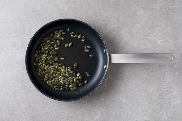 Die Kürbiskerne in derselben Pfanne ohne Zugabe von Fett bei mittlerer Hitze 2–4Min. anrösten, bis sie knistern und goldbraun sind. Zum Abkühlen aus der Pfanne nehmen und mit 1EL Olivenöl sowie 1 Prise Salz vermengen.