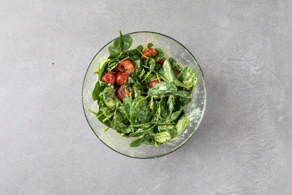 Den Backofen auf 200°C (180°C Umluft) vorheizen. Den Joghurt mit 1–2TL Currypulver, 1EL Olivenöl und 1EL Essig gut verrühren und mit Salz und Pfeffer abschmecken.