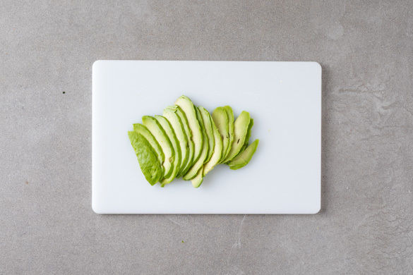 Die Avocado halbieren und den Kern entfernen. Das Fruchtfleisch mit einem Esslöffel aus der Schale lösen und in dünne Scheiben schneiden.