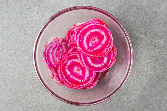 In einem mittelgroßen Topf 600ml leicht gesalzenes Wasser für den Reis zum Kochen bringen. In einem zweiten Topf ausreichend Wasser für die Eier aufkochen. Die Chioggia-Beten schälen und in möglichst dünne Scheiben schneiden. 4EL Essig mit 1EL Wasser, 1TL Zucker und 1/2TL Salz verrühren, bis sich Zucker und Salz aufgelöst haben, dann die Bete-Scheiben untermengen.