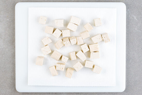 In einem kleinen Topf 400ml leicht gesalzenes Wasser zum Kochen bringen. Den Tofu mit etwas Küchenkrepp trocken tupfen und in 1–2cm große Würfel schneiden. Die Tofuwürfel zwischen Küchenkrepp legen, dann mit einem Teller und einem Buch oder einer Konservendose beschweren, um weitere Flüssigkeit auszupressen.