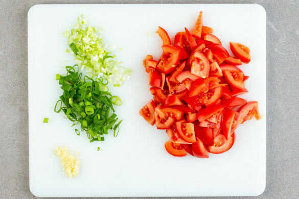 Inzwischen die Tomaten in ca. 1cm breite Spalten schneiden und die Spalten quer halbieren. Den grünen Teil der Lauchzwiebeln in dünne Ringe schneiden, den weißen Teil fein hacken. Den Knoblauch schälen und fein würfeln.