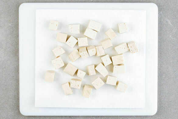In einem mittelgroßen Topf 800ml leicht gesalzenes Wasser zum Kochen bringen. Den Tofu mit etwas Küchenkrepp trocken tupfen und in 1–2cm große Würfel schneiden. Die Tofuwürfel zwischen Küchenkrepp legen, dann mit einem Teller und einem Buch oder einer Konservendose beschweren, um weitere Flüssigkeit auszupressen.