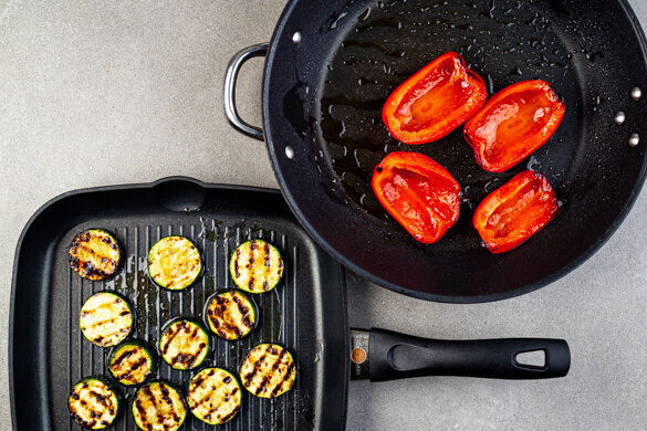 Die Zucchini in ca. 1cm dicke Scheiben schneiden. Die Paprika vierteln und entkernen. Die Zucchini in einer Schüssel mit 2TL Olivenöl vermengen, dann in einer Grillpfanne bei mittlerer Hitze auf jeder Seite ca. 4Min. braten, bis sie gerade gar ist. Die Schüssel aufbewahren. Die Paprika in einer großen Pfanne mit 2TL Olivenöl bei mittlerer Hitze ca. 5Min. braten.