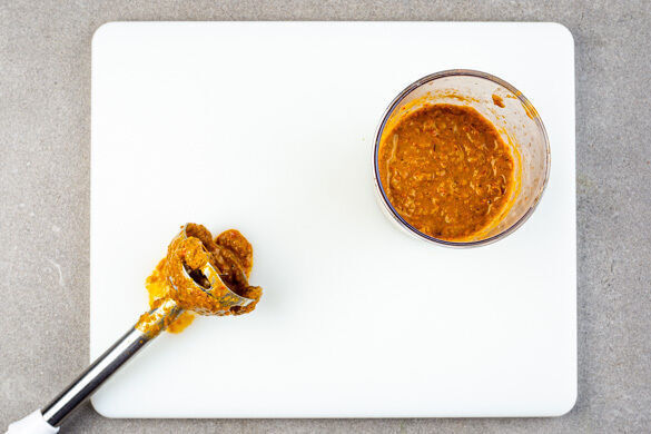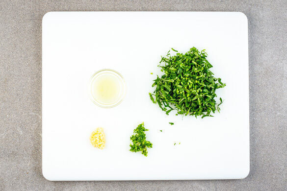 Die Limettenschalen abreiben, dann die Limetten halbieren und auspressen. Den Koriander samt Stängeln fein schneiden. Den Knoblauch schälen und sehr fein würfeln oder durch eine Knoblauchpresse drücken.