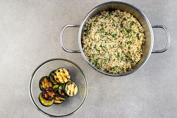 Die gegrillte Zucchini zurück in die Schüssel geben, mit der Limettenschale, dem Knoblauch sowie 2 kräftigen Prisen Salz vermengen und mit einem Teller abgedeckt ziehen lassen. Die Lauchzwiebeln entfernen, dann den Koriander, 2EL Limettensaft und 1 kräftige Prise Salz unter den Reis rühren. Die Lauchzwiebeln aufbewahren.