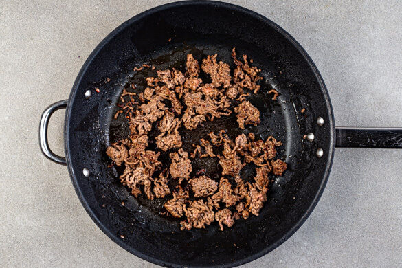 Das Hackfleisch in einer mittelgroßen Pfanne mit 1EL Pflanzenöl und 1 Prise Salz bei starker Hitze ca. 2Min. anbraten, bis es leicht gebräunt ist.