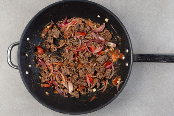Das Hackfleisch in einer großen Pfanne mit 2EL Pflanzenöl und 1 kräftigen Prise Salz bei starker Hitze ca. 2Min. anbraten, bis es leicht gebräunt ist.
