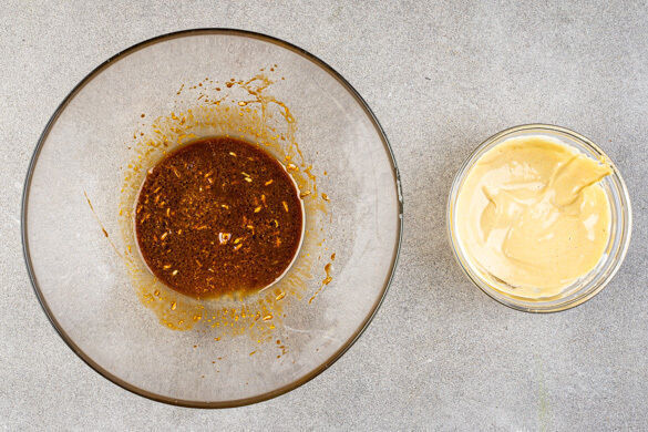 Den Grill anfeuern oder den Backofen auf 220°C (200°C Umluft) vorheizen. 8 Schaschlikspieße in warmem Wasser einweichen. Die Fenchelsamen mit 2EL Olivenöl, 2EL Balsamicoessig und 2TL Senf zu einem Dressing verrühren. 4EL Mayonnaise mit 2TL Senf, 1TL Balsamicoessig und 1TL Wasser zu einem Dip verrühren.