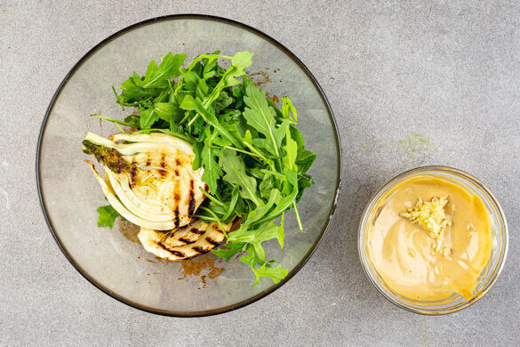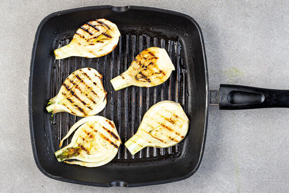 Die Fenchelscheiben auf einer heißen Stelle des Grillrosts auf jeder Seite 2–3Min. grillen, bis sich deutliche Röstspuren abzeichnen. Alternativ eine Grillpfanne sehr heiß werden lassen und die Fenchelscheiben hineingeben, dabei leicht an den Boden drücken und von jeder Seite 2–3Min. braten. Den Fenchel vom Grill oder aus der Pfanne nehmen und mit dem Dressing vermengen.