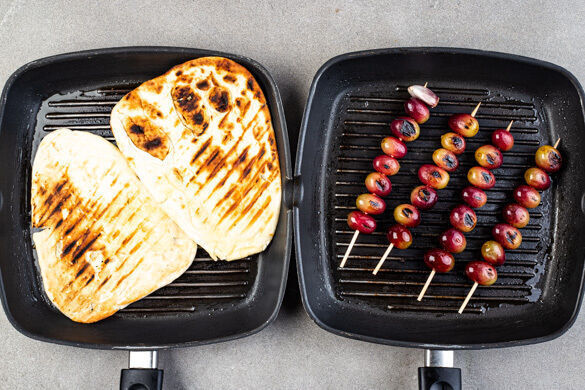 Die Traubenspieße auf einer heißen Stelle des Grillrosts ca. 6Min. grillen, bis sich deutliche Röstspuren abzeichnen, dabei gelegentlich wenden. Alternativ die Grillpfanne sehr heiß werden lassen und die Traubenspieße ca. 6Min. in der Pfanne braten. Das Naan auf dem Grill von jeder Seite 1–2Min. erwärmen, bis es Röstspuren hat oder 5–6Min. im Ofen backen.