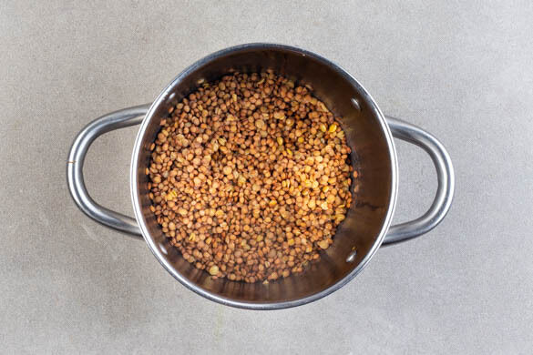 In einem mittelgroßen Topf 1L Wasser zum Kochen bringen. Die Linsen in einem Sieb mit kaltem Wasser abspülen, abtropfen lassen und in das kochende Wasser geben. Die Linsen bei mittlerer bis niedriger Hitze abgedeckt 15–18Min. köcheln lassen, bis sie gar, aber noch bissfest sind. In ein Sieb abgießen und kalt abspülen, dann zurück in den Topf geben.