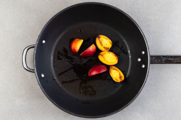 Den Pfirsich halbieren und entsteinen, dann das Fruchtfleisch in 6 Spalten schneiden. Die Pfirsichspalten in einer mittelgroßen Pfanne mit 1TL Butter bei mittlerer Hitze auf jeder Seite 1–2Min. braten, bis sie leicht gebräunt sind, dann aus der Pfanne nehmen und beiseitestellen. Tipp: Wenn die Pfirsichspalten noch hart sind, vor dem Braten 1 Prise Zucker darüberstreuen.
