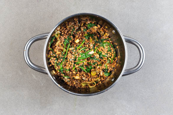 Den Spinat zu dem Lauch geben und 2–3Min. mitgaren, bis er gerade zusammenfällt. Dann das Gemüse und die Zwiebelmarmelade unter die Linsen rühren. Mit 1TL Salz würzen und großzügig mit (frisch gemahlenem) Pfeffer abschmecken.