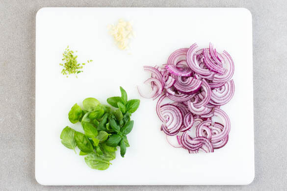 Den Knoblauch schälen und grob würfeln. Die Zwiebeln schälen, halbieren und in feine Streifen schneiden. Die Basilikumblätter von den Stängeln zupfen, die Blätter beiseitelegen, die Stängel fein schneiden.