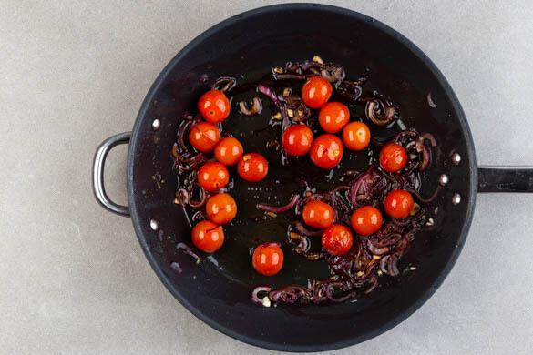 Die Zwiebeln und den Knoblauch in der Pfanne mit 2EL Olivenöl und 1 kräftigen Prise Salz bei mittlerer Hitze ca. 2Min. anschwitzen, bis sie weich sind, dabei regelmäßig umrühren. Die Basilikumstängel, die Kirschtomaten, 2EL Balsamicoessig sowie je 1 Prise Salz und Pfeffer dazugeben und weitere 6–7Min. braten. Gelegentlich umrühren.