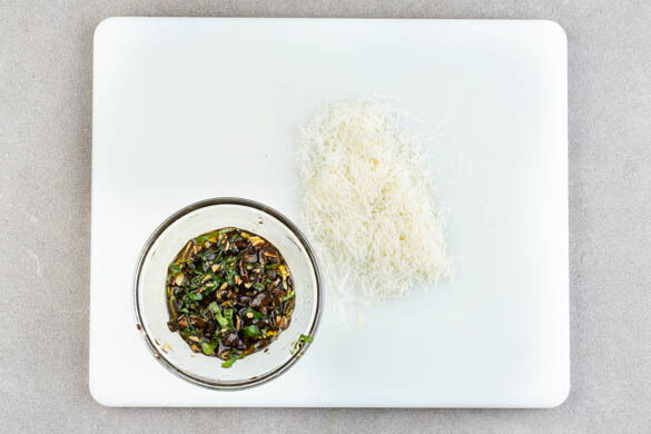 Die Kürbiskerne grob hacken. Die Basilikumblätter grob schneiden. Den Käse fein reiben. Die Kürbiskerne und die Basilikumblätter mit 2EL Olivenöl, 2EL Balsamicoessig sowie je 1 Prise Salz und Pfeffer verrühren.
