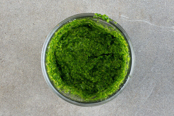 Die 1/2 des Rucolas mit den Sonnenblumenkernen, dem Knoblauch, dem Basilikum samt Stängeln, der 1/2 des Käses, 2EL Olivenöl, 1EL hellen Essig und 3EL Wasser in einem hohen Gefäß mit einem Stabmixer zu einem glatten Pesto pürieren. Mit je 1/2TL Salz und Pfeffer würzen, ggf. mehr Wasser hinzufügen.