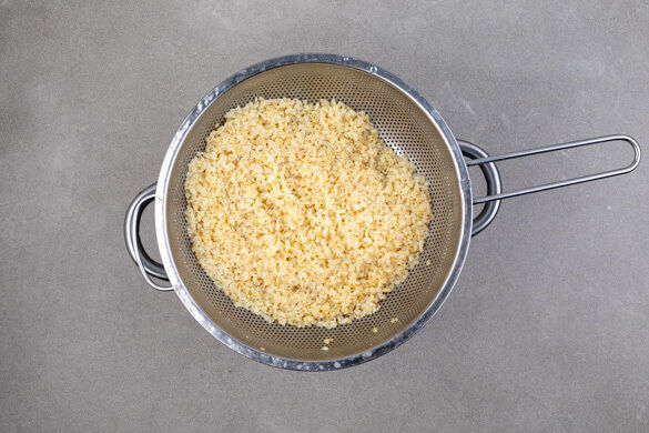 In einem kleinen Topf 300ml leicht gesalzenes Wasser mit der 1/2 des Brühgewürzes zum Kochen bringen. Den Bulgur in das kochende Wasser rühren und abgedeckt bei niedriger Hitze 8–10Min. sanft köcheln lassen, bis das Wasser aufgesaugt und der Bulgur gar ist. Den Bulgur abgedeckt ohne Hitzezufuhr bis zum Servieren ziehen lassen.