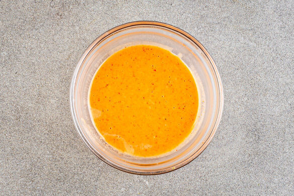 Die Zitronenschale abreiben, dann die Zitrone halbieren und auspressen. Den Knoblauch schälen und sehr fein würfeln oder durch eine Knoblauchpresse drücken. Das Tahini mit der Sriracha-Sauce, dem Knoblauch, der 1/2 des Zitronensafts, 1EL Wasser, 1TL Honig und 1 Prise Salz verrühren. Das Dressing nach Belieben mit mehr Zitronensaft und Salz abschmecken.
