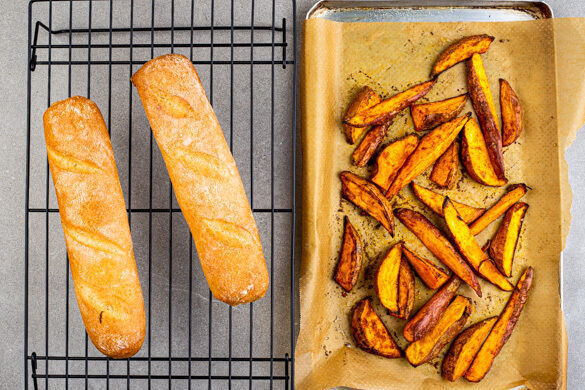 Den Backofen auf 240°C (220°C Umluft) vorheizen. Die Süßkartoffeln samt Schale in Spalten schneiden und auf einem mit Backpapier ausgelegten Backblech mit 1EL Olivenöl, 1TL Paprikapulver und je 1 kräftigen Prise Salz und Pfeffer vermengen, dann 15–20Min. im Ofen goldbraun und gar backen. Die Brötchen auf einem Ofenrost 6–8Min. backen, dann auskühlen lassen.