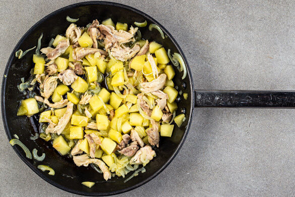 Das Fleisch trocken tupfen, mit 1TL Salz in das kochende Wasser geben und abgedeckt bei mittlerer Hitze in 8–10Min. gar köcheln. Das Fleisch aus dem Topf nehmen, abkühlen lassen und mit 2 Gabeln in kleine Stücke zupfen. Das Kochwasser aufbewahren.