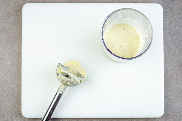 Die Wasabipaste, die weißen Lauchzwiebelstücke, 1EL Limettensaft oder Essig, 1EL Olivenöl und 1 kräftige Prise Salz zu den Cashews geben und mit einem Stabmixer cremig pürieren. Mit Salz, Pfeffer und ggf. mehr Limettensaft oder Essig abschmecken.
