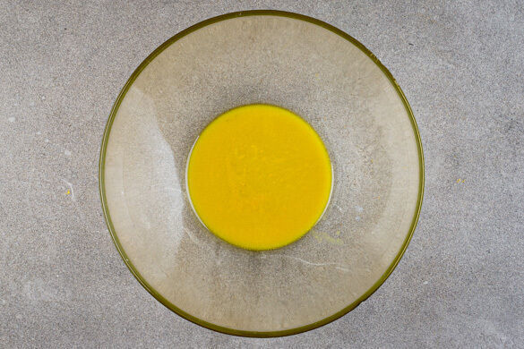 2EL Olivenöl mit 1EL Essig, 1TL Senf und 1/2TL Honig zu einem Dressing verrühren.