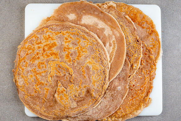 In derselben und einer zweiten Pfanne 1TL Butter oder Öl bei mittlerer Hitze schmelzen. Die Pfannenböden mit einer dünnen Schicht Teig bedecken und diesen 1–2Min. backen. Anschließend wenden und noch mal 1–2Min. backen. Auf einem Teller warm halten und so fortfahren, bis der gesamte Teig verbraucht ist. Ggf. mehr Butter oder Öl in die Pfannen geben. Der Teig ergibt etwa 12 Crêpes.