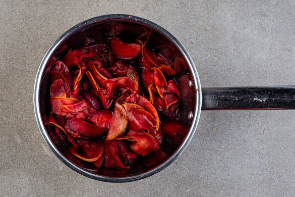 Die Pflaumen vierteln und entsteinen, dann die Viertel noch mal halbieren. Die Äpfel vierteln, entkernen und in dünne Scheiben schneiden.