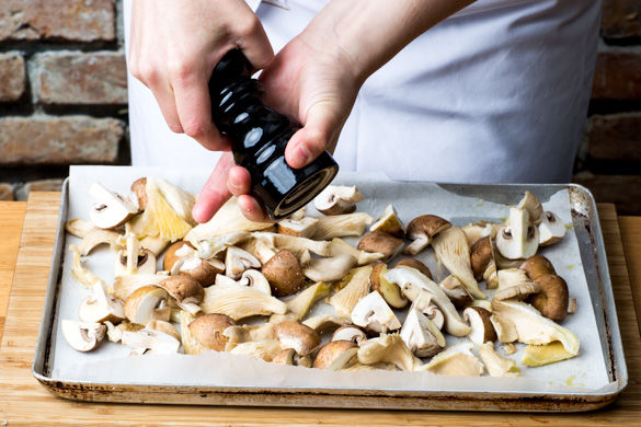 Den Ofen auf 180°C Umluft vorheizen. Austernpilze halbieren, die anderen Pilze vierteln. Den Knoblauch schälen und in feine Scheiben schneiden. Die geschnittenen Pilze und Knoblauch auf ein mit Backpapier belegtem Backblech verteilen und in 1-2EL Olivenöl wenden und mit Salz und Pfeffer würzen. Für ca. 10-12Min. im Ofen rösten, bis die Pilze braun sind.