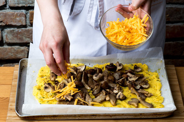Die Pilze aus dem Ofen nehmen und auf 250°C Grill stellen. Die Polenta mit Salz und Pfeffer abschmecken und mithilfe eines nassen Esslöffels ca. 1-1,5cm dick auf ein mit Backpapier ausgelegtes Backblech verstreichen. Mit Pilzen belegen. Sumach und restlichen Käse darüber verteilen und für ca. 4-5Min. im Ofen grillen, bis die Käsekruste leicht goldbraun ist.
