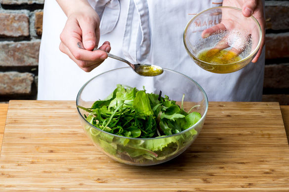 Aus 1-2EL Olivenöl, 1EL Essig, Salz und Pfeffer eine leichte Vinaigrette anrühren und mit dem Salat mischen. Die Tomaten-Salsa über die Polenta-Pizza verteilen und mit Salat servieren.