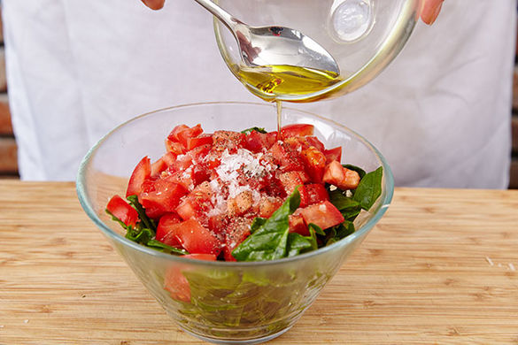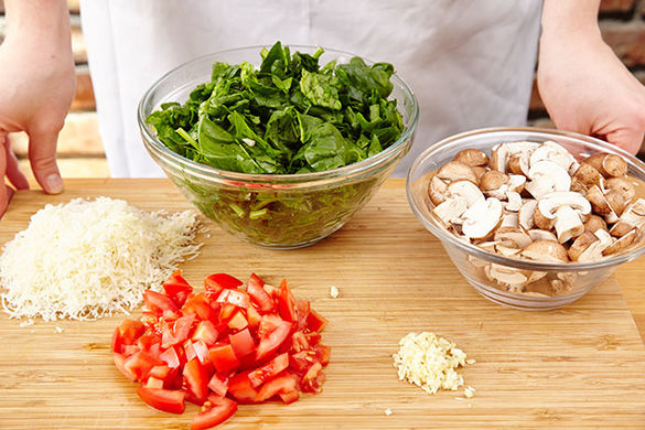 Die Pilze mit 1–2EL Olivenöl bei mittlerer Hitze in einer großen Pfanne ca. 3–5Min. braten, bis sie leicht braun werden. Dann den zerkleinerten Spinat und den Knoblauch hinzufügen und ca. 2Min. mitbraten, bis der Spinat zusammenfällt.