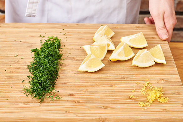Zwischendurch die Zitronenschale abreiben, dann die Zitrone in Spalten schneiden. Einige Stängel Dill beiseitelegen, den restlichen Dill fein schneiden.