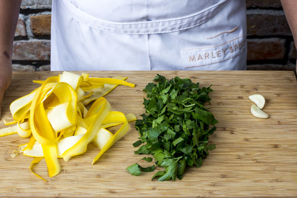 In einem großen Topf ausreichend gesalzenes Wasser für die Pasta aufsetzen. Inzwischen die Enden der Zucchini entfernen und mit einem Sparschäler in langen Streifen abschälen. Die Petersilie samt Stängel grob hacken. Dem Knoblauch schälen und halbieren.