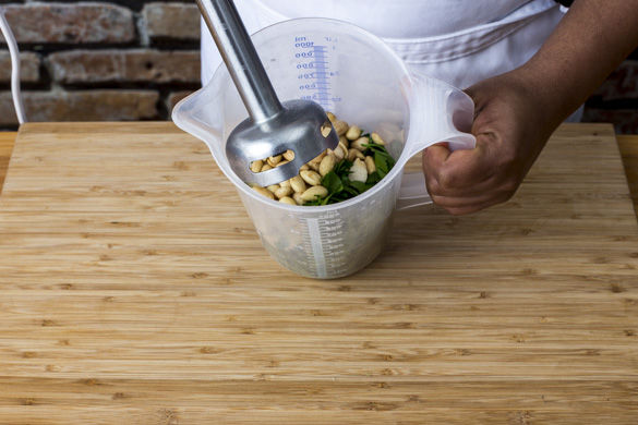 Die gerösteten Mandeln mit den Knoblauchhälften und der gehackten Petersilie mit ca. 2-3EL Olivenöl mithilfe eines Stabmixers fein pürieren. Anschließend die Hälfte des Frischkäses einrühren und gut mit Salz und Pfeffer würzen.