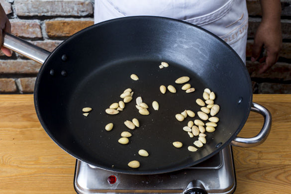 In der mittelgroßen Pfanne auf mittlerer Hitze die Mandeln rösten, bis sie braun sind. Vorsicht, sie können schnell verbrennen. Die Pfanne aufbewahren.
