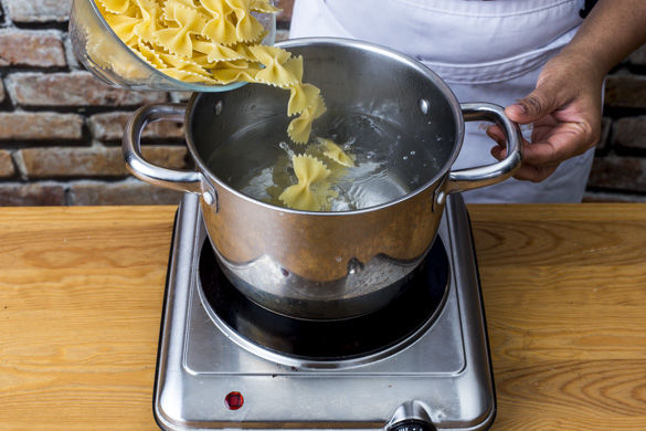Sobald das Wasser kocht, die Pasta für ca. 10-12Min. kochen, bis die Farfalle bissfest sind. Ca. 100ml Pastawasser abschöpfen, den Rest abgießen und die Pasta kalt abschrecken.