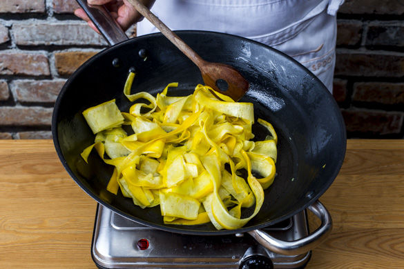 In der gleichen Pfanne nun 1EL Olivenöl auf hoher Hitze erwärmen und die Zucchinistreifen für für ca. 1-2Min. anschwitzen.