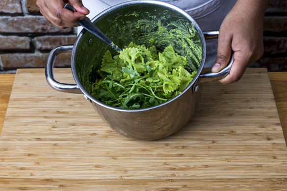 Zum Schluss die Zucchini mit der Pasta und dem Pesto im Topf mischen und etwas Pastawasser hinzufügen, bis alles gleichmäßig bedeckt ist. Den Rucola unterheben und nochmal mit Salz und Pfeffer abschmecken, dann servieren.