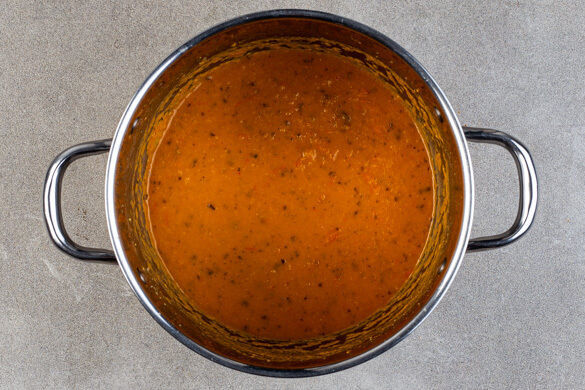 Das Gemüse aus dem Ofen nehmen. Die geröstete Paprika in ein hohes Gefäß geben und mit einem Stabmixer grob pürieren. Den Stabmixer noch nicht abspülen. 1EL Butter in kleine Würfel schneiden, unter die pürierte Paprika mengen und schmelzen lassen.