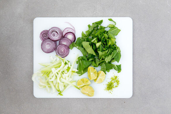 Die Zwiebel schälen und in dünne Ringe schneiden. Den weißen Teil des Pak Choi in dünne Streifen schneiden, den grünen Teil grob zerschneiden. Die Limettenschale fein abreiben, dann die Limette in Spalten schneiden. Die Karotte ggf. schälen und in dünne Scheiben schneiden.