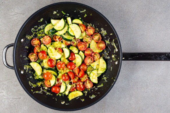 Den Knoblauch, den Lauch und die Zucchini in einer großen Pfanne mit 1EL Olivenöl sowie je 1 Prise Salz und Pfeffer bei mittlerer Hitze 4–5Min. anbraten, dabei gelegentlich umrühren.