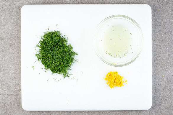 Den Dill samt Stängeln fein schneiden. Die Zitronenschale abreiben, dann die Zitrone halbieren und auspressen.