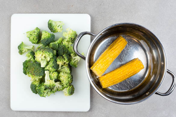 In einem mittleren Topf ausreichend gesalzenes Wasser für den Mais und den Brokkoli aufkochen. Die Maiskolben schälen, ggf. vorhandene Härchen entfernen. Den Brokkoli in mundgerechte Röschen schneiden. Den Mais bei mittlerer Hitze ca. 12Min. kochen, bis er gar und saftig ist. In den letzten ca. 2Min. den Brokkoli zugeben und mitkochen. Das Gemüse in ein Sieb abgießen.