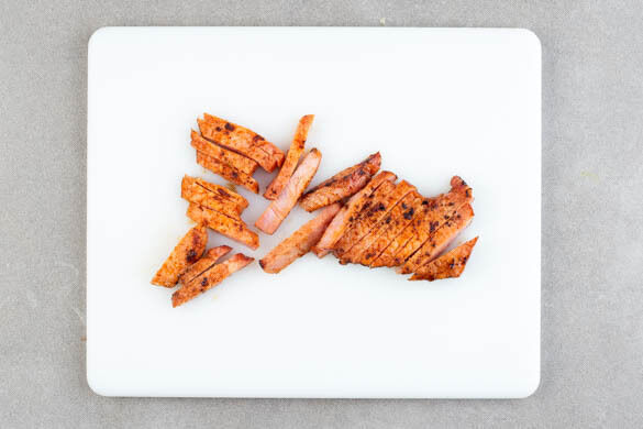 Das Fleisch in ca. 0,5cm dünne Streifen schneiden. Den Spinat unter den Brokkoli und den Mais mengen. Den Salat auf Teller verteilen, das Fleisch darauf anrichten und mit dem Jalapeño-Dressing beträufelt servieren.