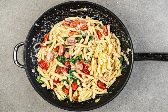 Lust auf Meer? Bitte nicht drängeln, die Fahrt geht gleich los! Sie führt durch mediterrane Küstengewässer, wo wir den Star unseres Pastagerichts vorfinden, die elegante Makrele. Sanft geräuchert blubbert sie nun in einer cremigen Sauce mit fruchtigen Kirschtomaten und Babyspinat. Welch ein Duft! Jetzt aber schnell zurück in den Heimathafen, bevor die hungrige Crew zu meutern beginnt ...