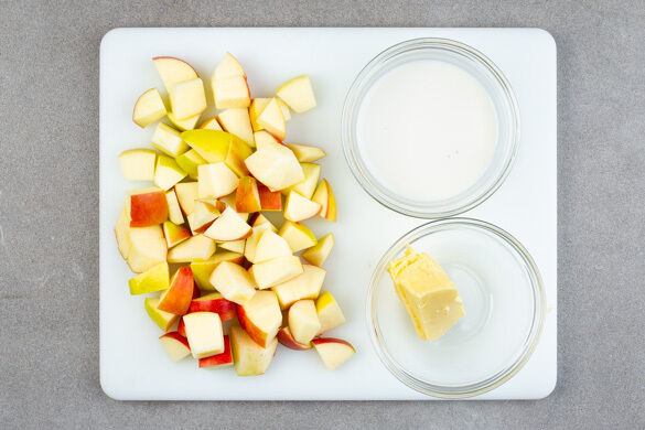 Den Backofen auf 195°C (175°C Umluft) vorheizen. Eine Springform (Ø20–22cm) mit 1EL Butter fetten oder mit Backpapier auslegen. 60g Butter abwiegen und Raumtemperatur annehmen lassen. 120ml Milch abmessen und beiseitestellen, die übrige Milch wird für dieses Rezept nicht benötigt. Die Äpfel vierteln, entkernen und in 1–2cm große Stücke schneiden.