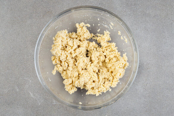 Das Mehl in ein feines Sieb geben und in eine Schüssel sieben, 1TL Backpulver, 130g Zucker und 1 kräftige Prise Salz dazugeben. Dann die weiche Butter, den Vanillezucker und 60ml Milch dazugeben und alles mit einem Handrührgerät vermengen, bis der Teig geschmeidig ist. Tipp: Wer kein Handrührgerät hat, kann auch einen Schneebesen verwenden, das dauert allerdings länger.